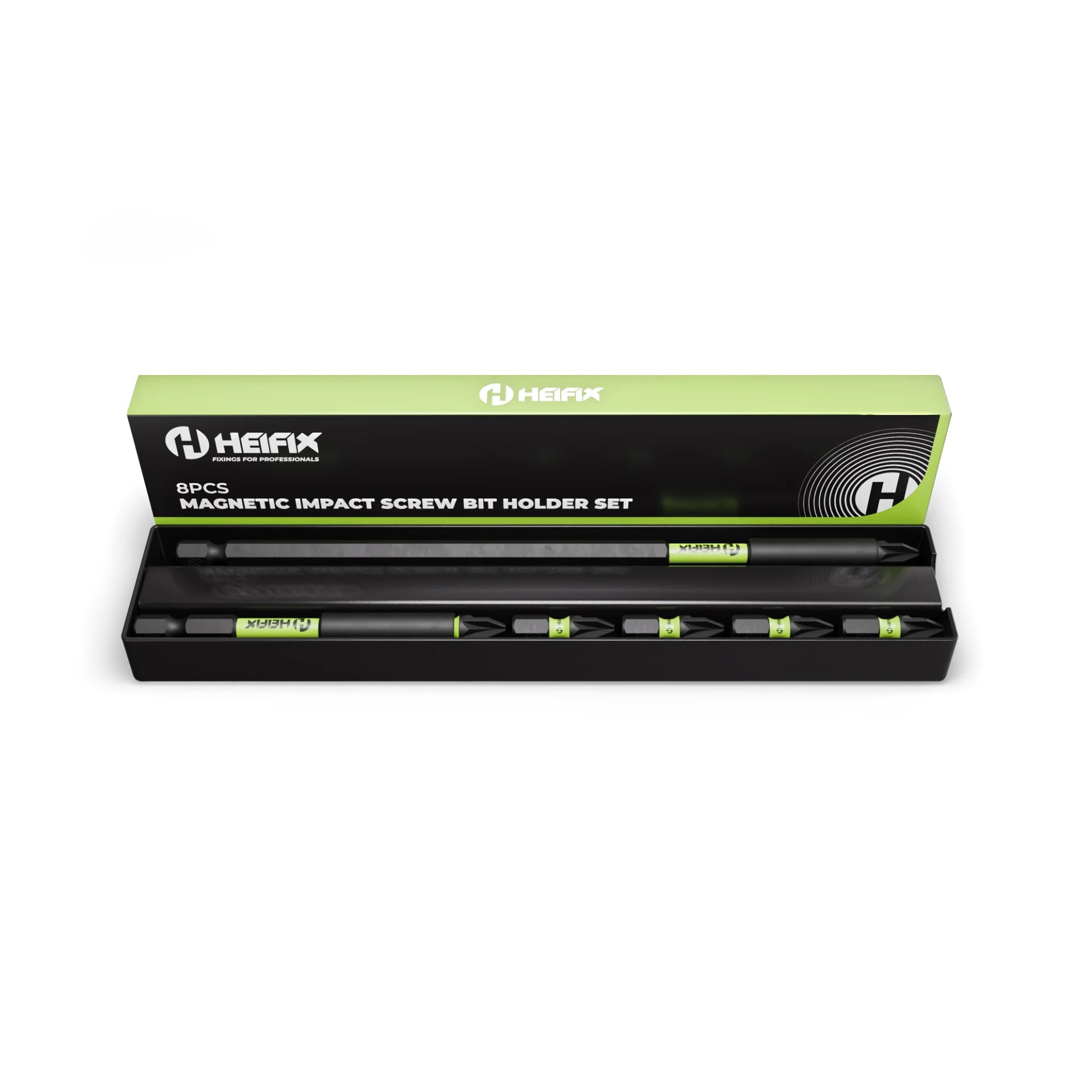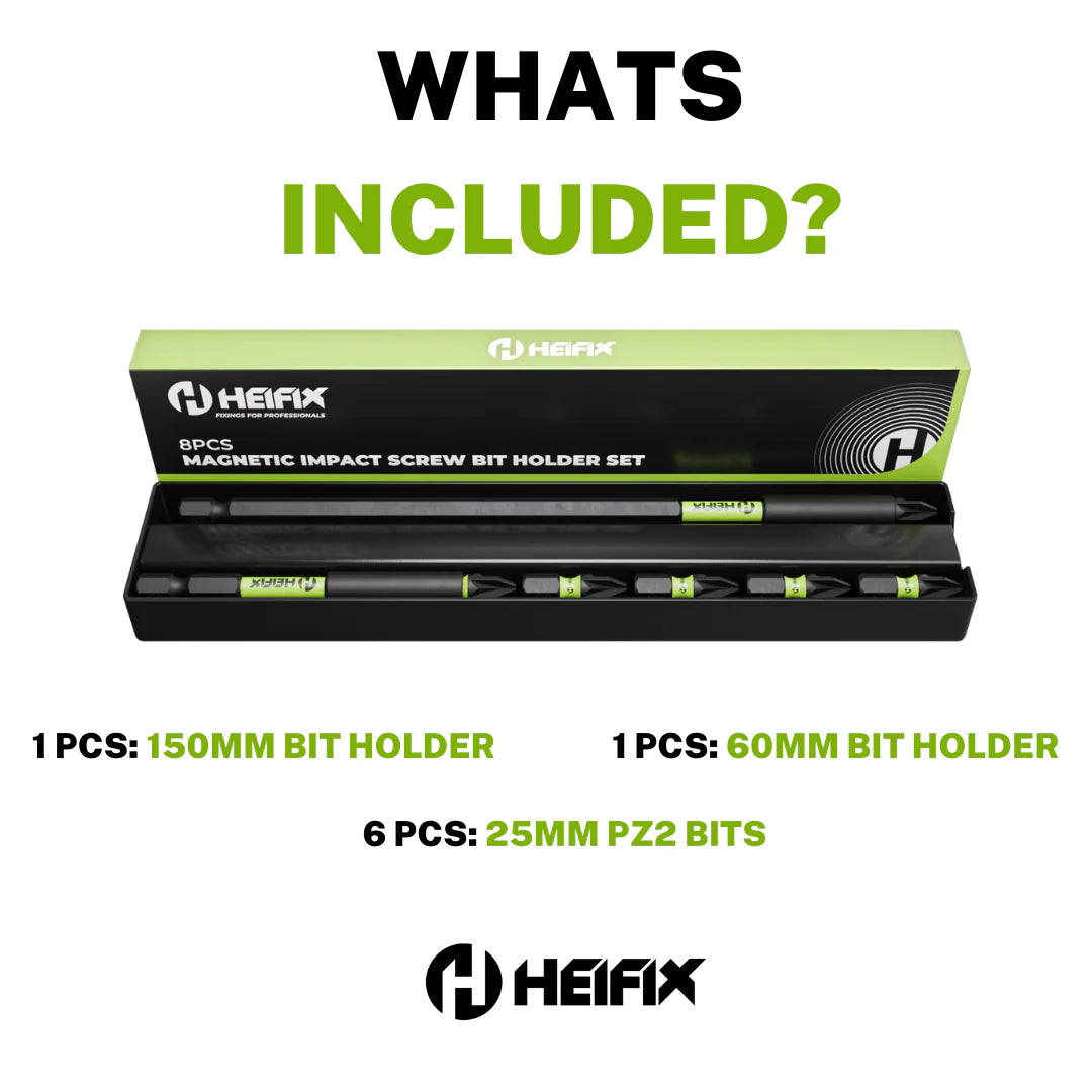 The Heifix 8 Piece Magnetic Bit Holder Set combines strength, precision, and sustainability. Designed for professionals and DIY enthusiasts alike, this set includes two durable bit holders (150mm and 60mm) and six high-performance 25mm PZ2 impact bits. Each component is crafted from hardened steel for maximum torque resistance and long-lasting reliability, even under heavy impact use. Magnetised tips ensure secure bit retention and easy one-handed operation, while precision-engineered Pozi-Drive bits deliver clean, consistent fastening. The corrosion-resistant finish keeps your tools performing at their best, job after job. Packaged in an eco-friendly, fully recyclable cardboard box, this set reduces waste without compromising on quality.
