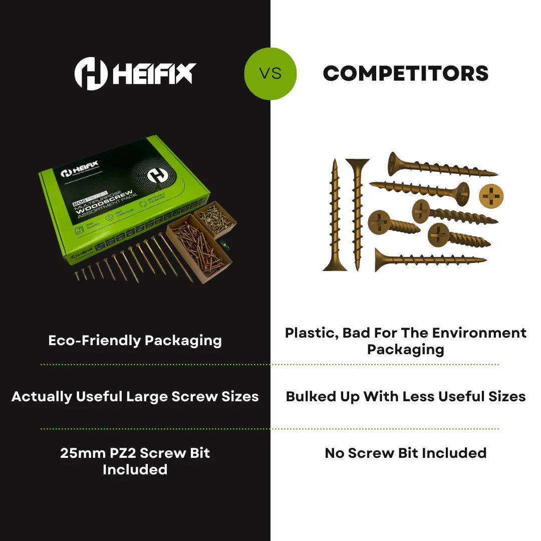 Whether you're a seasoned pro or a weekend DIYer, the Heifix 800-Piece Pozi Countersunk Wood Screw Set is a reliable, eco-friendly choice designed to make your work easier and more efficient. Add it to your toolkit today and experience the difference!